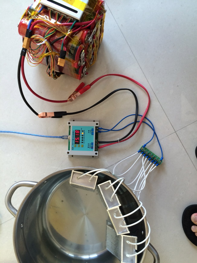 Next, I wanted to verify the capacity of the pack. I hooked it up to the battery capacity tester and set the amperage to 10A. After about 90 minutes the results were in: it tested out as 15.18Ah – slightly more than the advertised capacity of these batteries! I was quite pleased. You’ll note the power resistors were in a water bath – they were putting out a total of about 500 watts during testing and got quite hot – I even had to change to colder water about halfway through otherwise it might have started boiling. Will definitely need to get a better setup later as water + heaters isn’t exactly a brilliant idea.